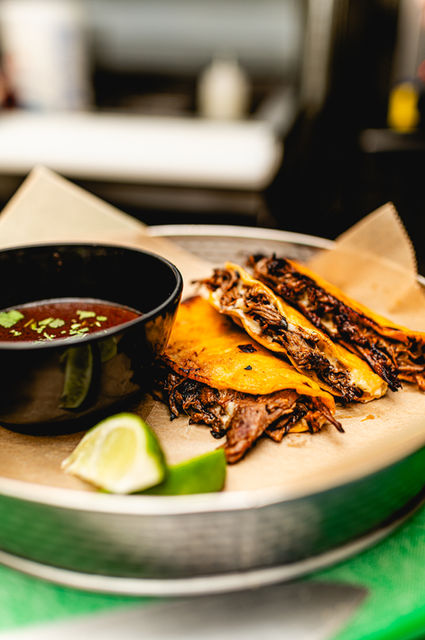 -Corn tortilla filled with marinated, slow cooked tender beef and shredded cheese served with cilantro onions and consome for dipping $4.99+tax each.